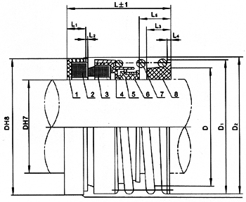 1、靜環(huán)墊 2、靜環(huán) 3、動(dòng)環(huán) 4、波紋管 5、傳動(dòng)套 6、緊圈 7、彈簧 8、彈簧座